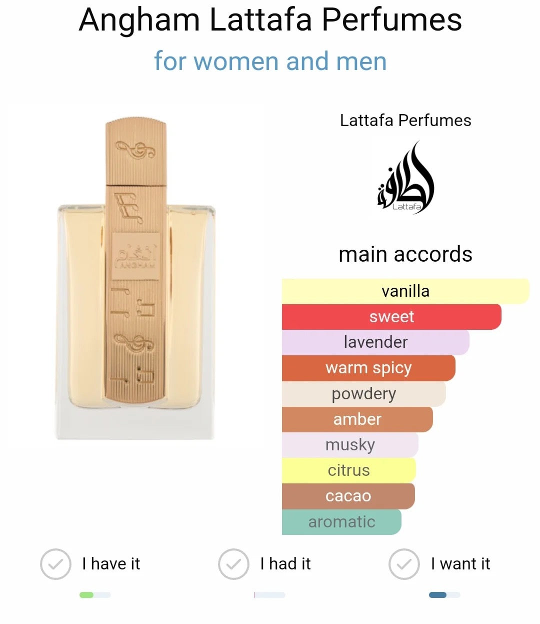 Angham by Lattafa Perfumes is a Oriental Vanilla fragrance for women.